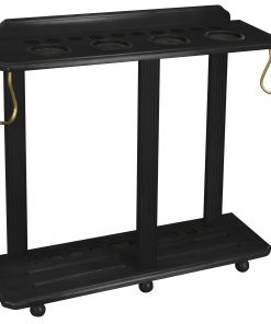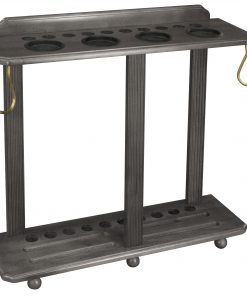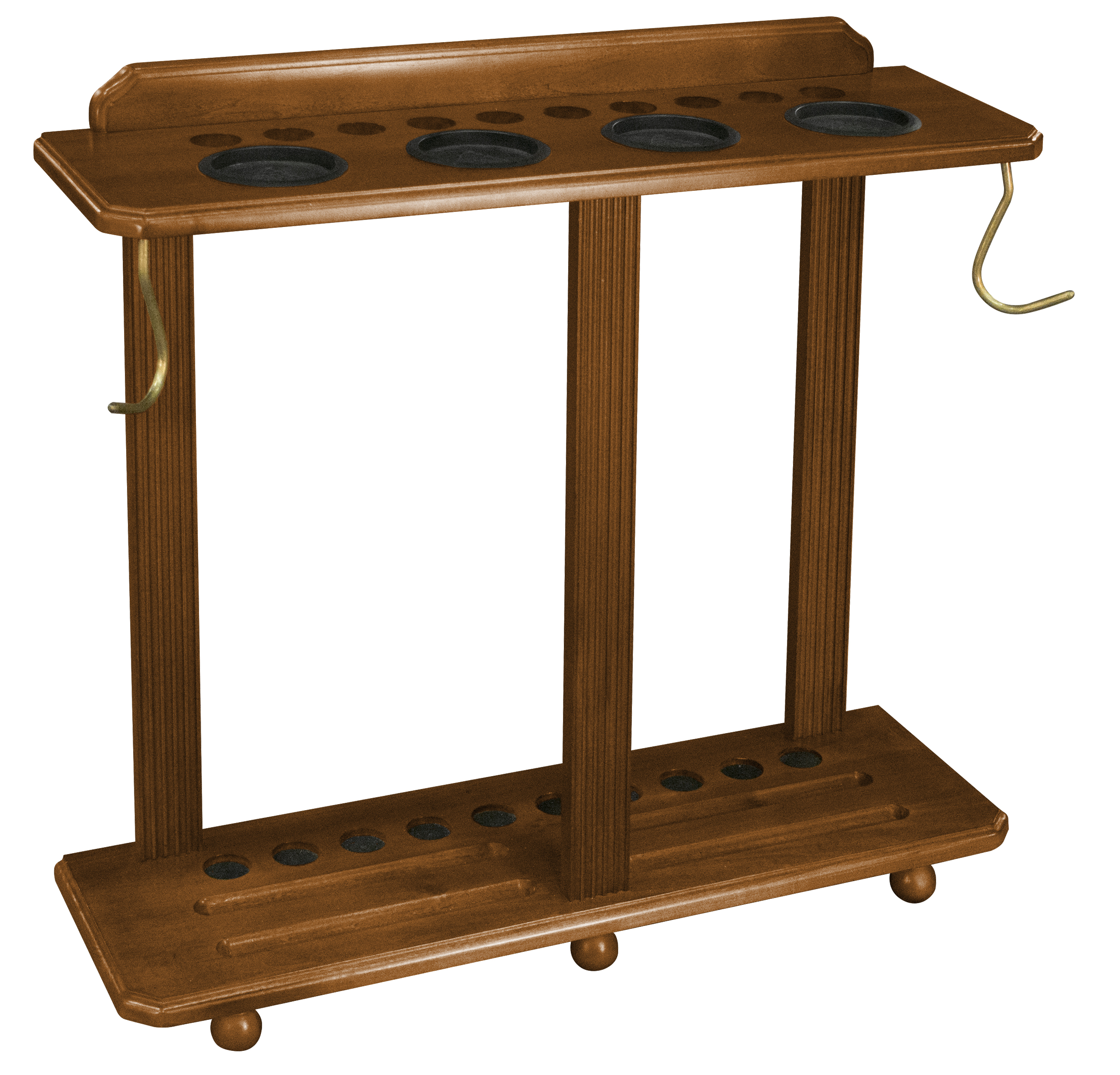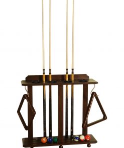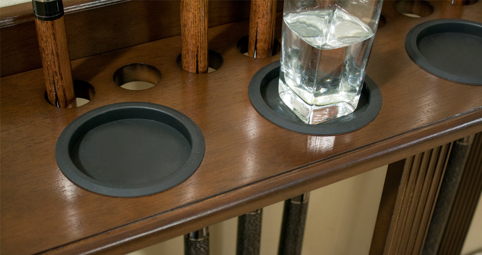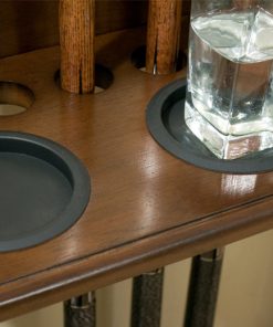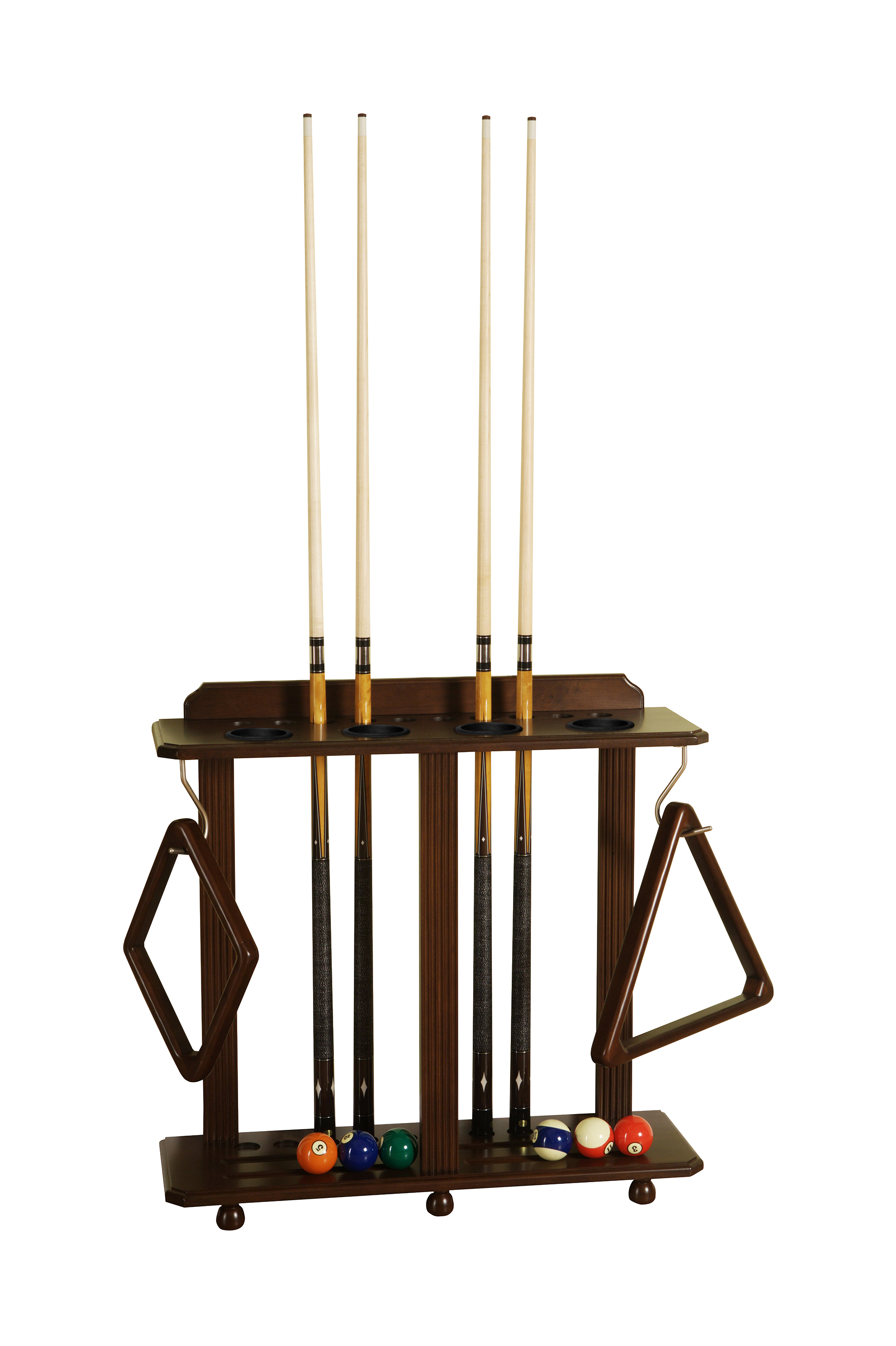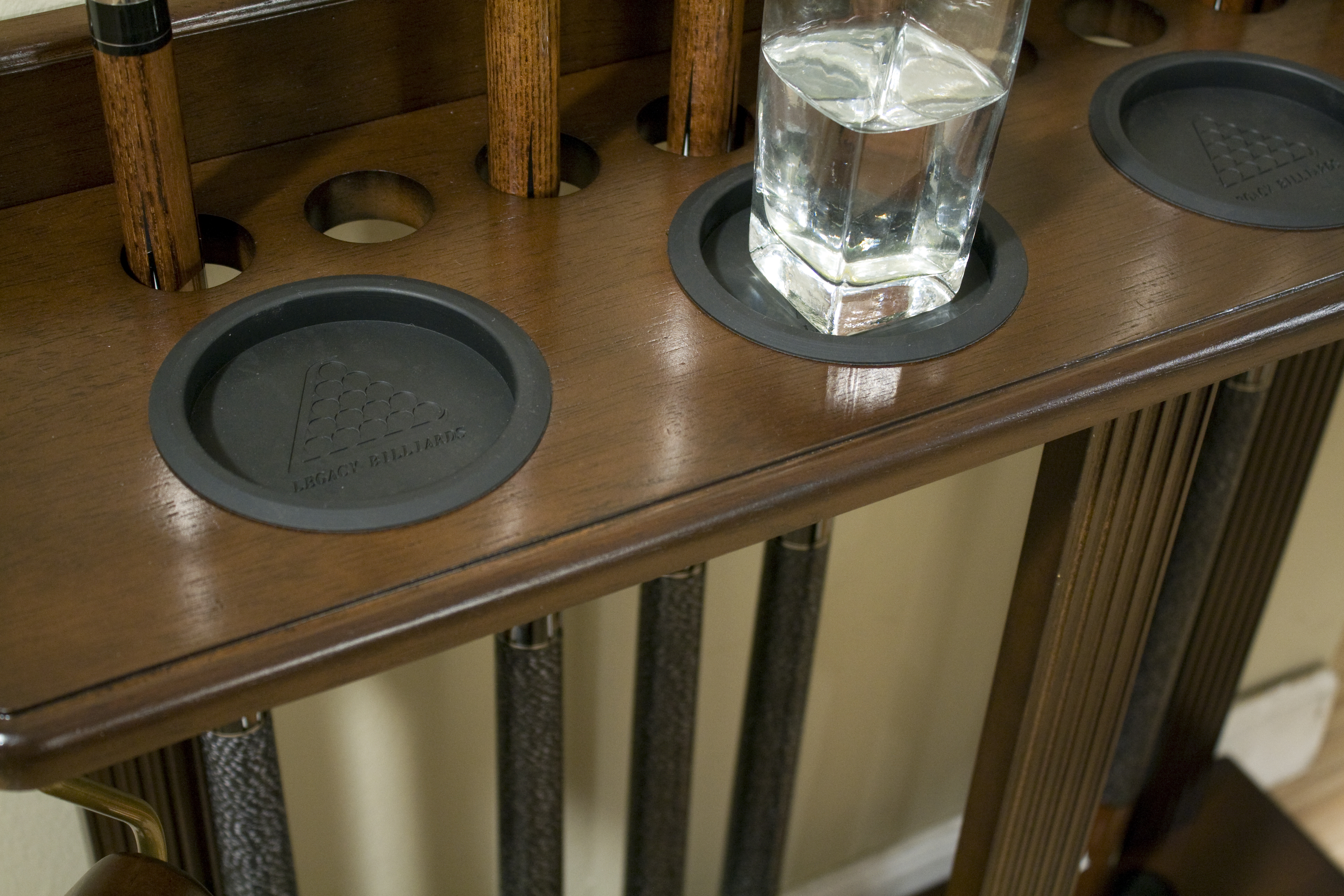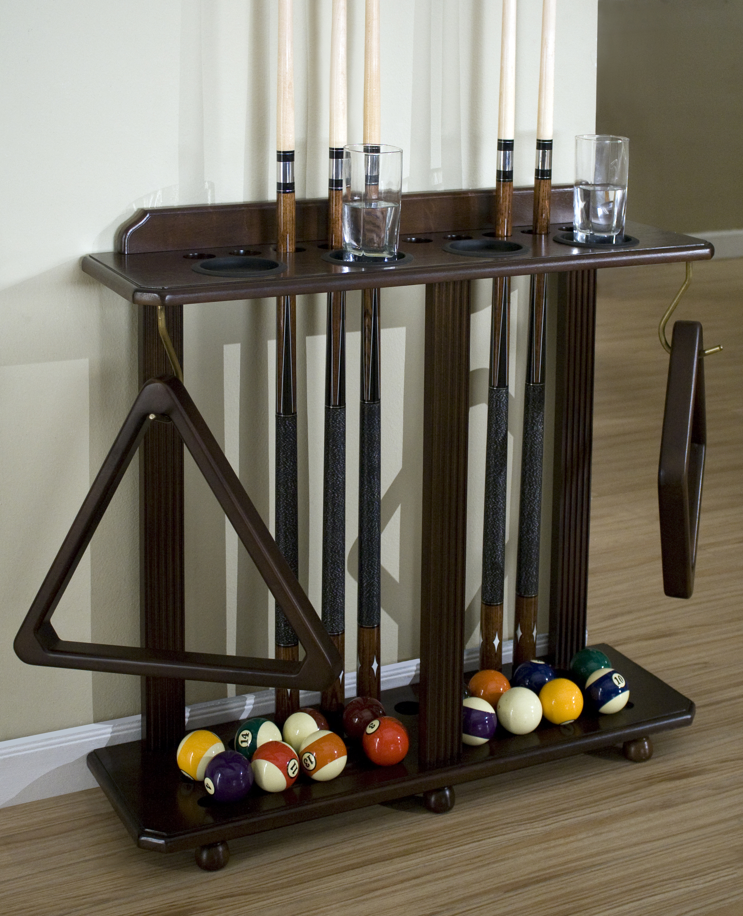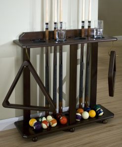 An attractive way to store up to 10 cues, 2 ball racks, balls and accessories all in one convenient area; keeping everything nice and tidy between uses. 4 recessed areas on top can serve as beverage holders or chalk cups.